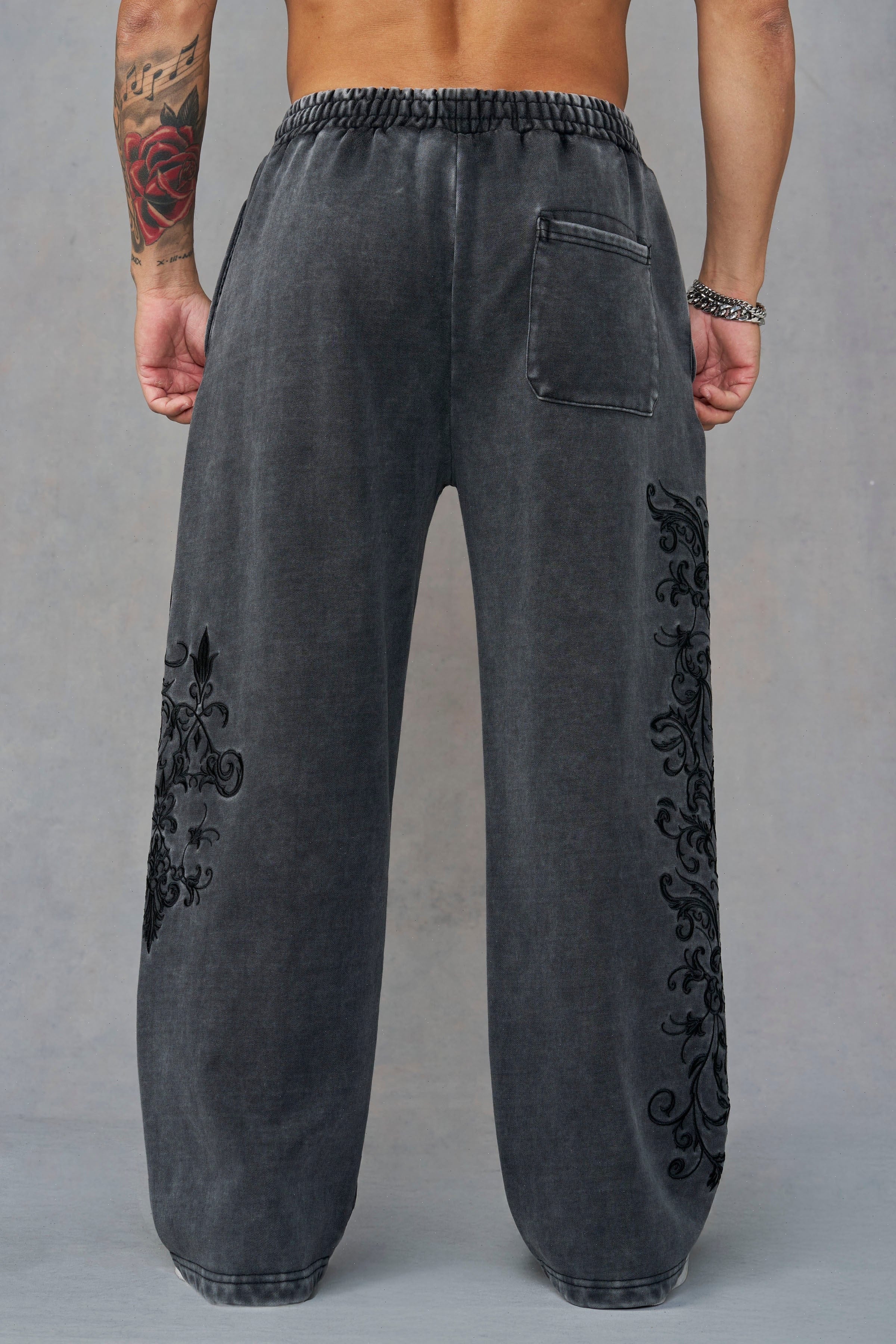 DESIGN: A heavy bomb of detail without trying too hard. These sweats use a washed base and pair it with oversized tonal embroidery that runs down both legs. They are ornate, gothic, and clean. The artwork is textured but not loud, giving the pants a premium feel while keeping the look subtle. Side pockets sit where they should, with an elastic waist and a draped leg that falls naturally over footwear. Easy to wear, but still stands out.