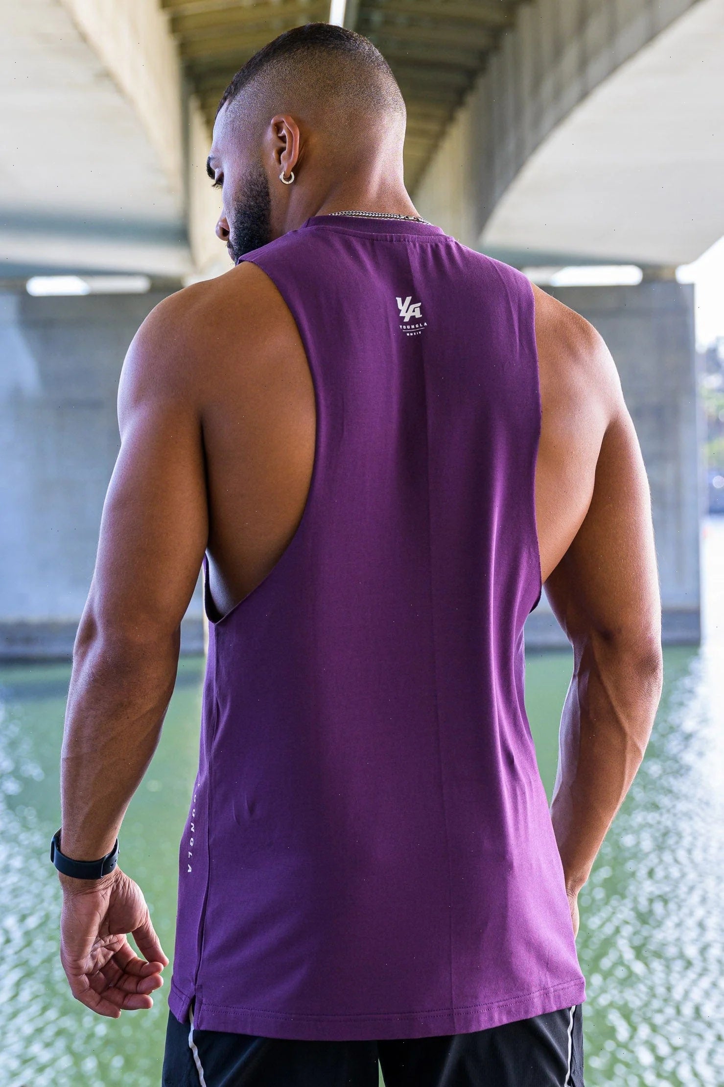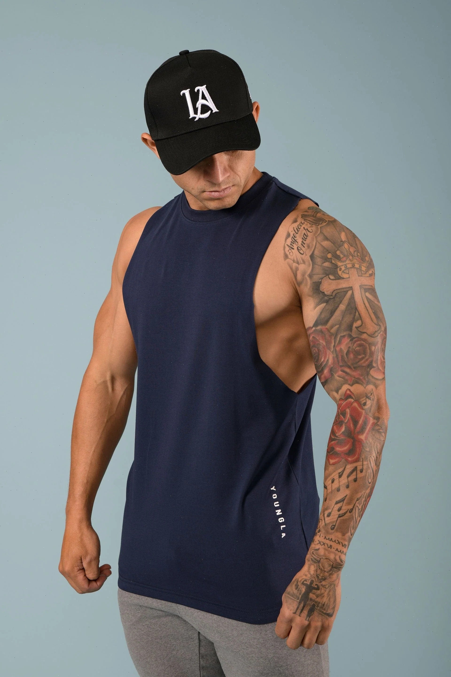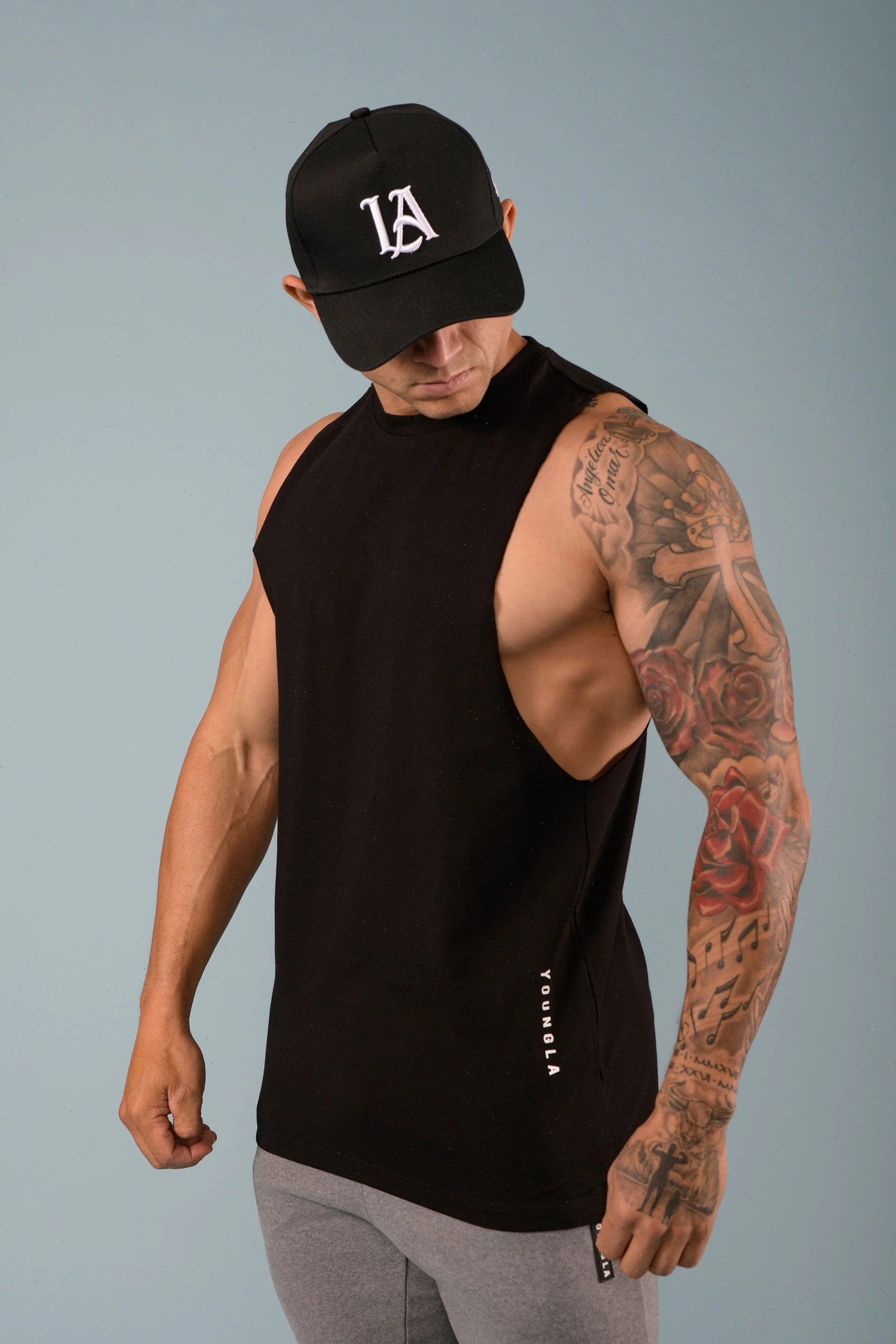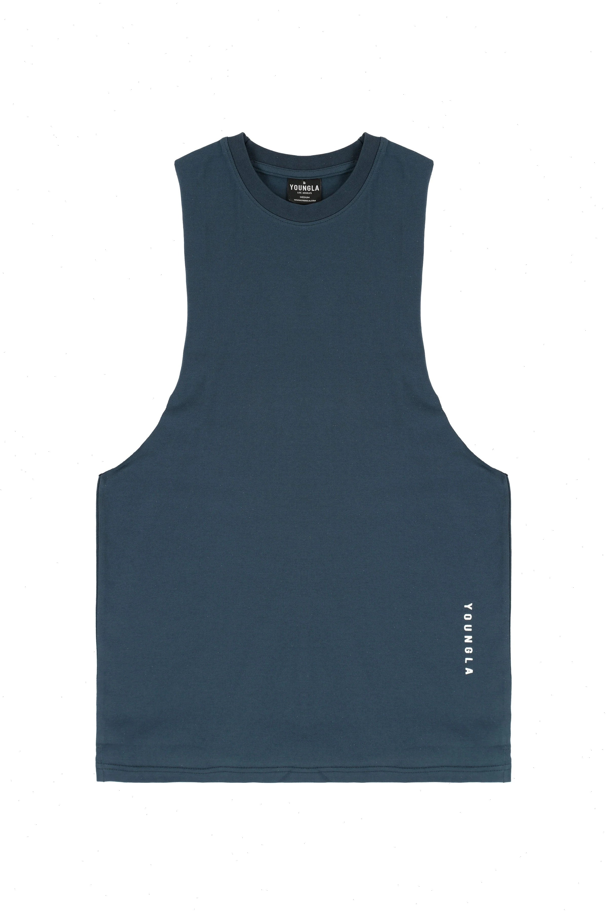 DESIGN: Introducing the delt tanks. Cut deeper on the shoulders to showcase the delts from all angles. They are made with soft cotton and stretchy lycra fabric, straight bottom hem cut, YoungLA high-density logo on the bottom, and YLA logo on the back.