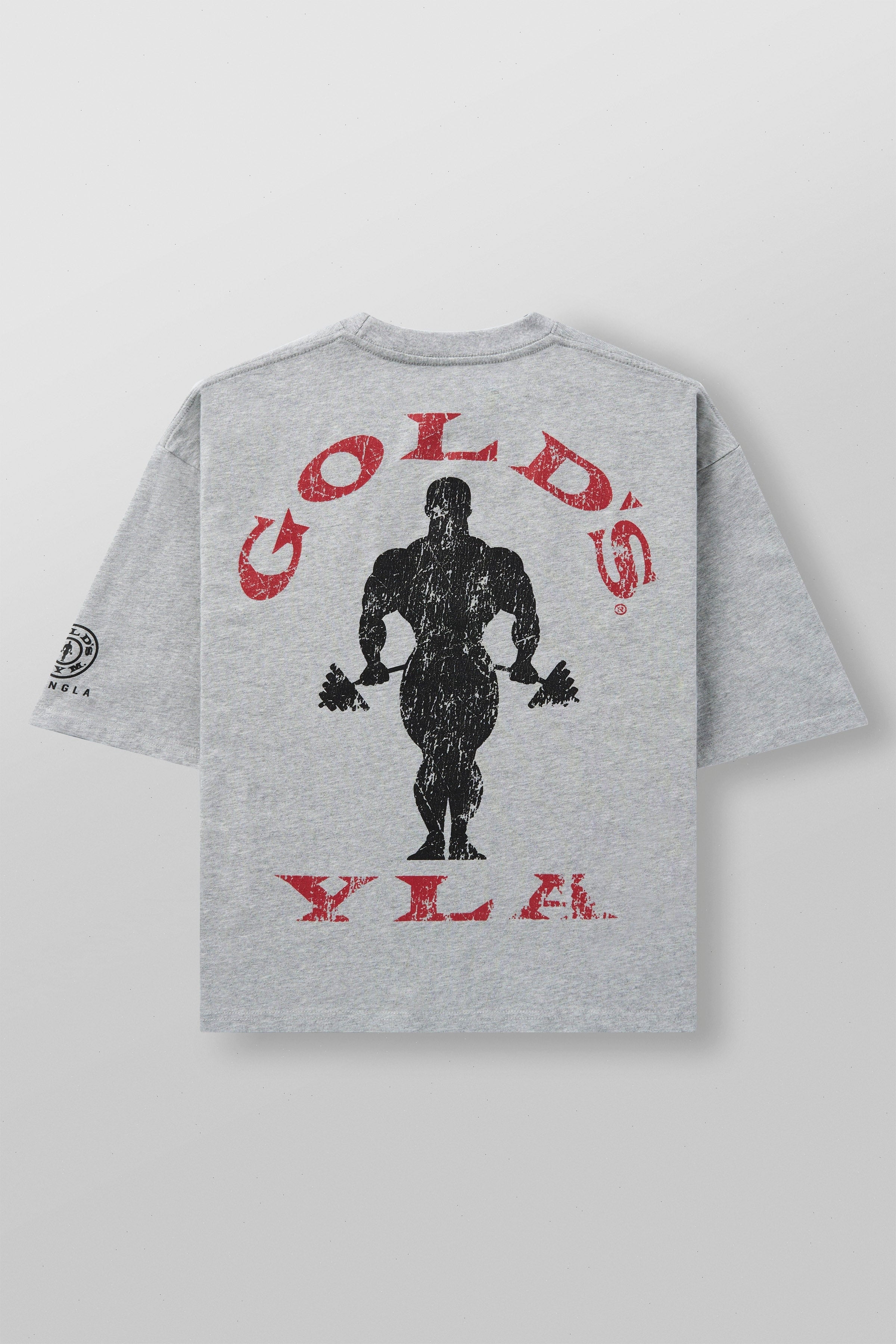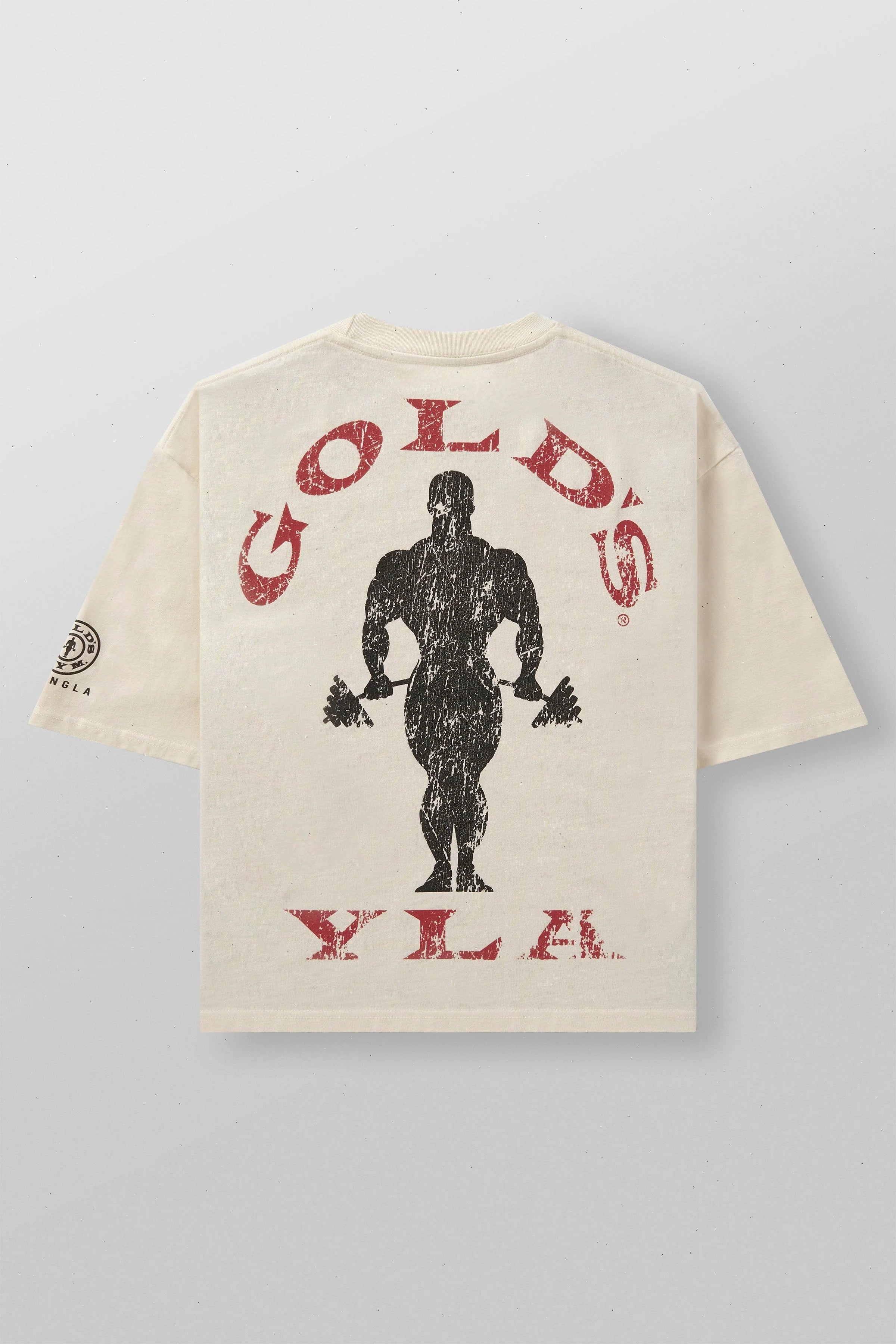 DESIGN: This YoungLA x Gold's Gym collaboration tee combines vintage-inspired graphics with a trendy, oversized boxy fit. Designed with a shorter length for a modern edge, it features a distressed Gold's Gym x YoungLA print on the back, giving it a classic, worn-in look that's perfect for casual wear or hitting the gym.