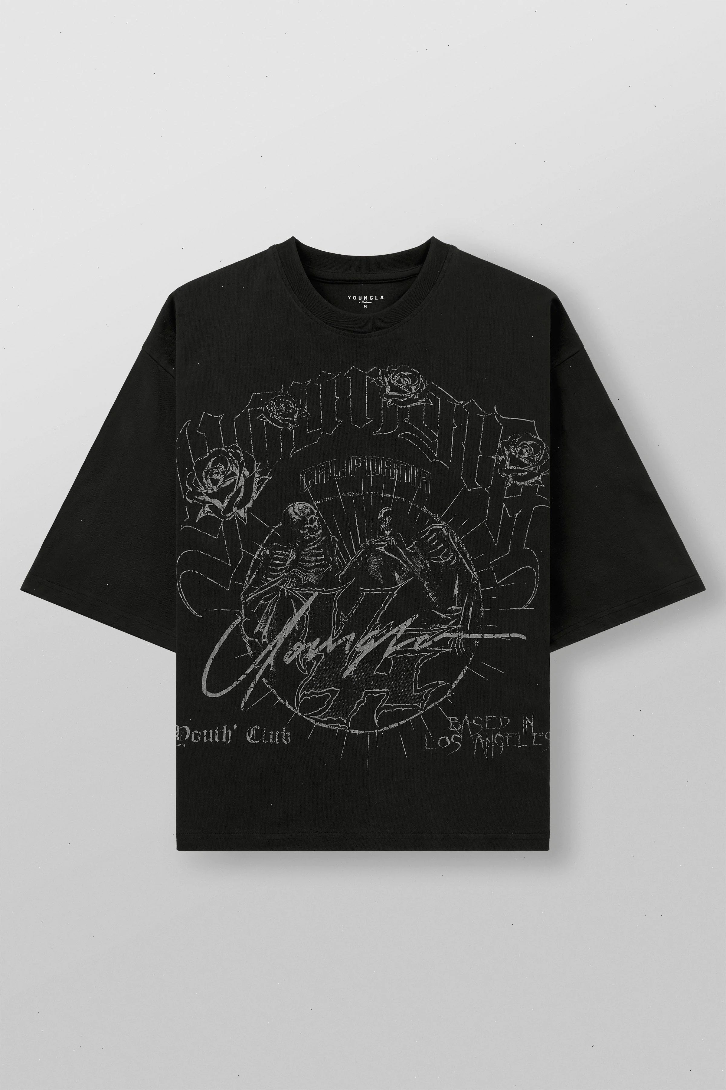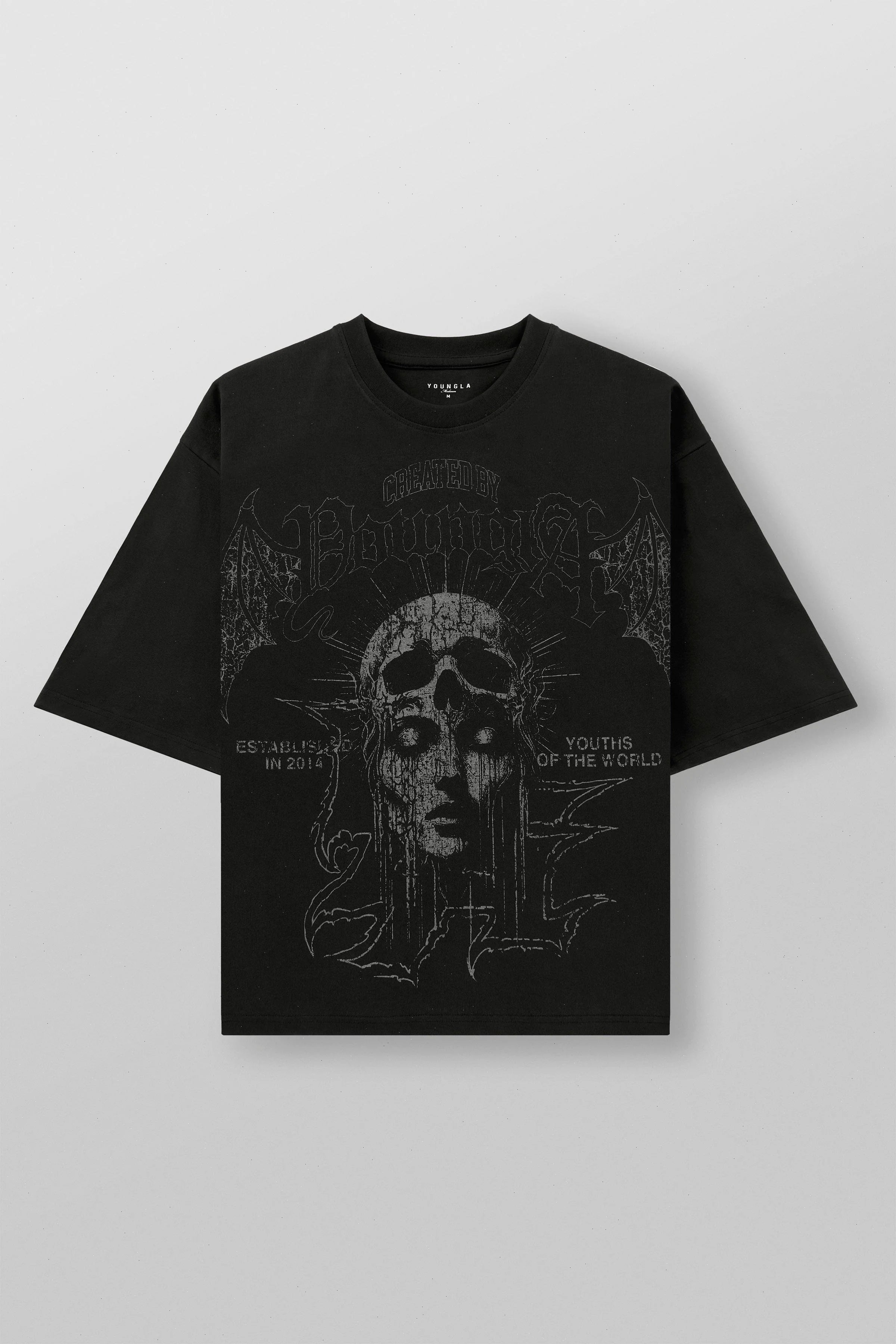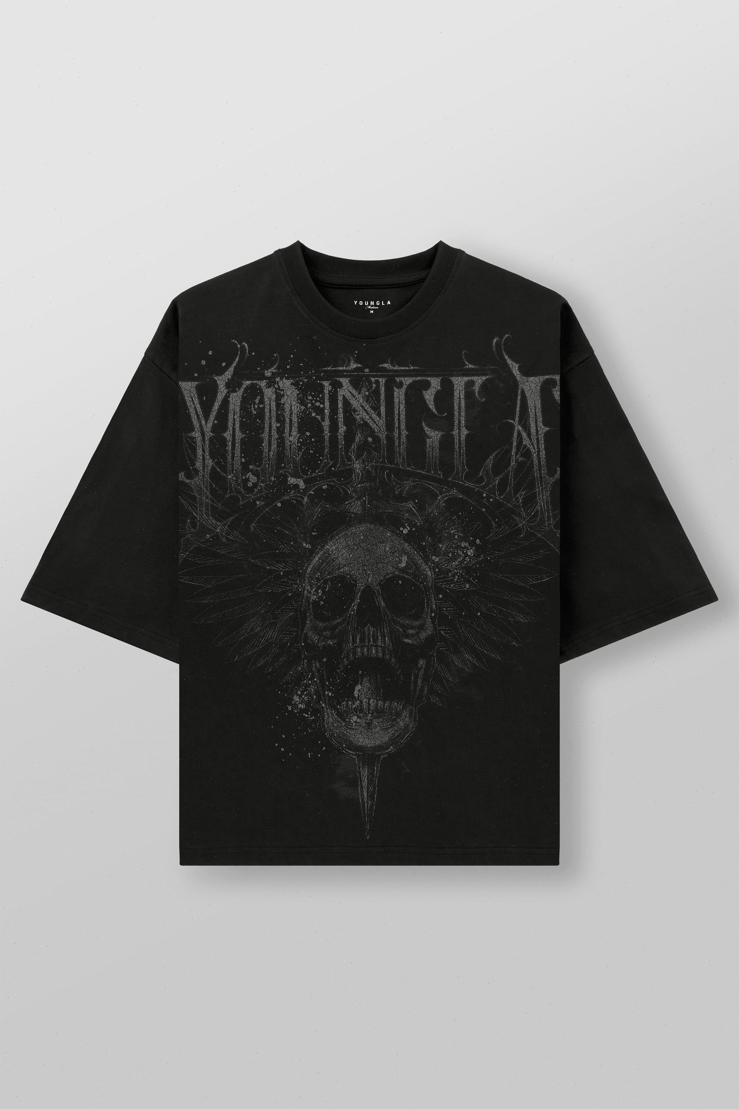 DESIGN: Meet the After Life Tees – edgy, acid-washed black tees made from 100% cotton for a boxy, cropped fit. Each tee showcases a unique print in muted grey tones, bringing four different designs to life with dark, captivating vibes.