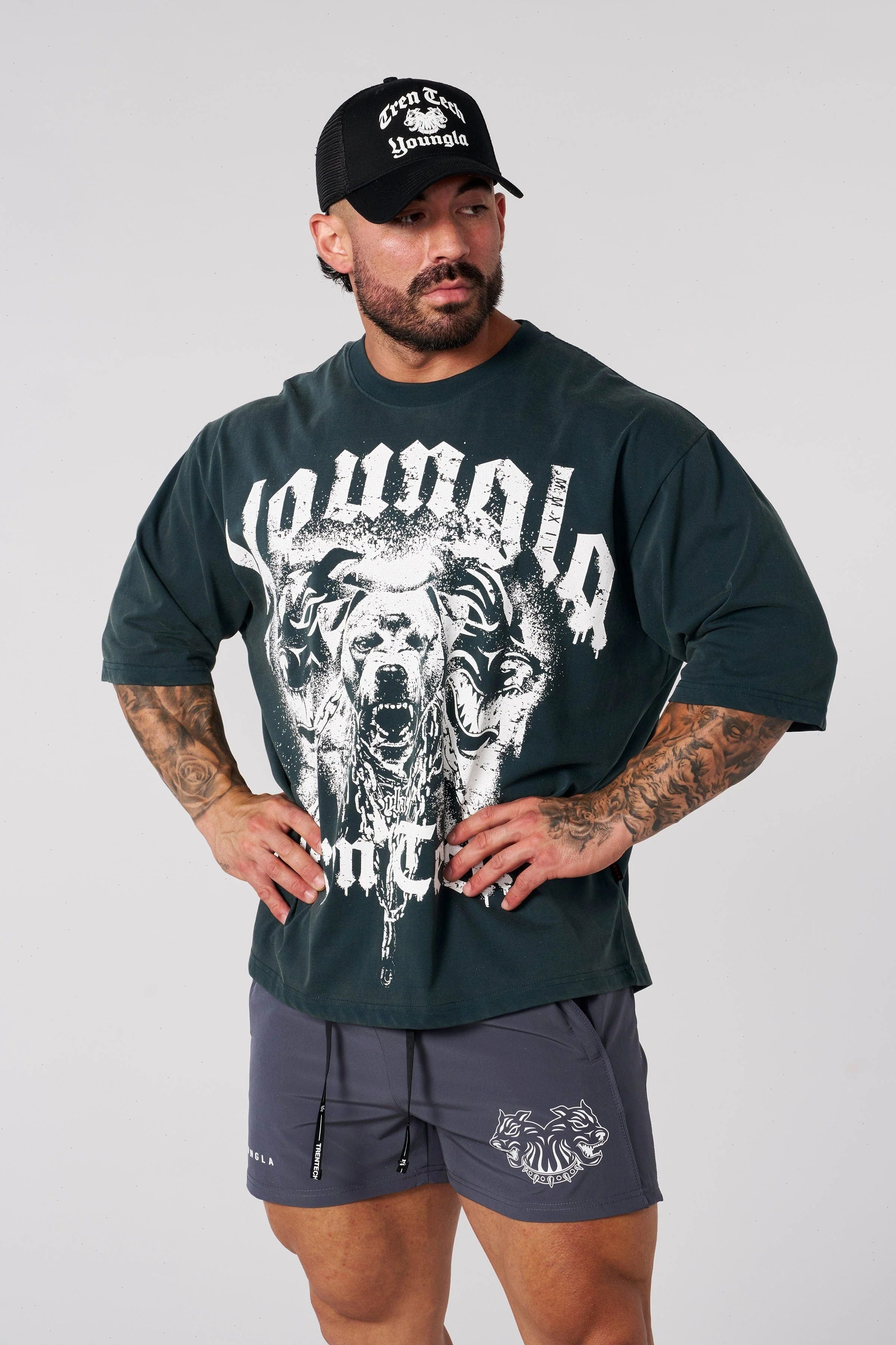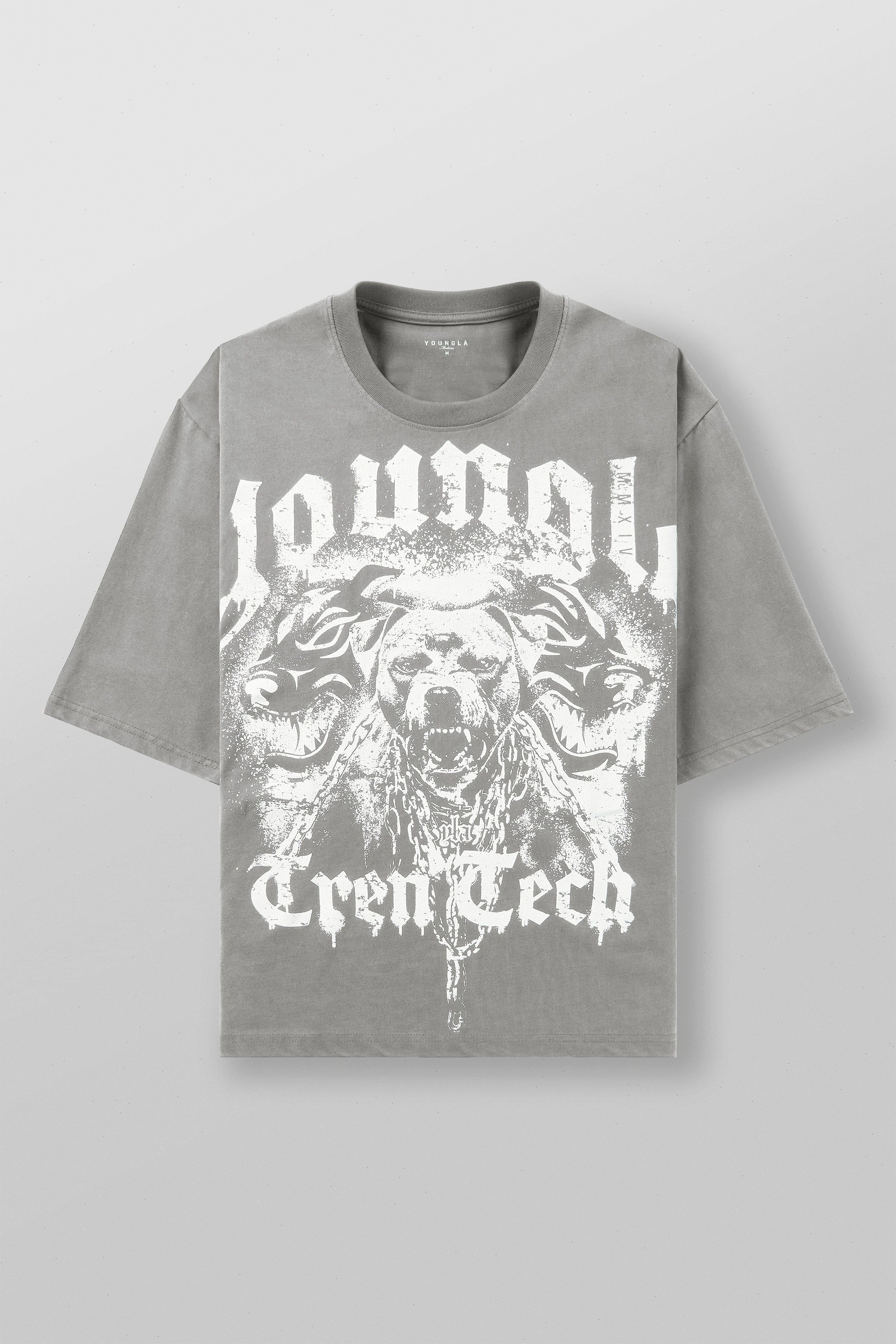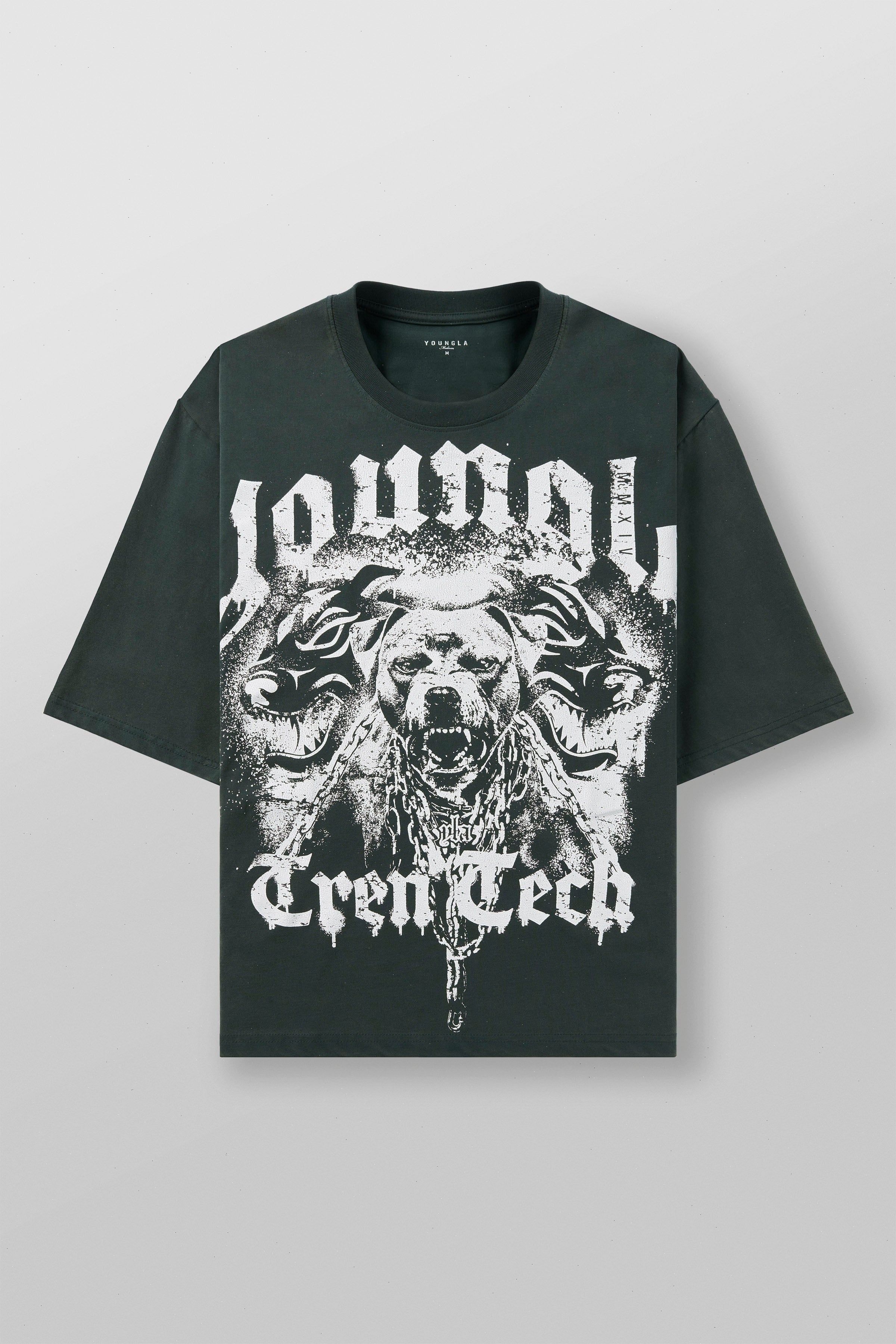 DESIGN: Unleash the dogs with these loose-fitting puppy dog tees, featuring a design of a barking pitbull flanked by two exotic dogs. Perfect for a relaxed yet bold look. Elevate your casual wardrobe with this eye-catching piece that combines comfort and fierce style.