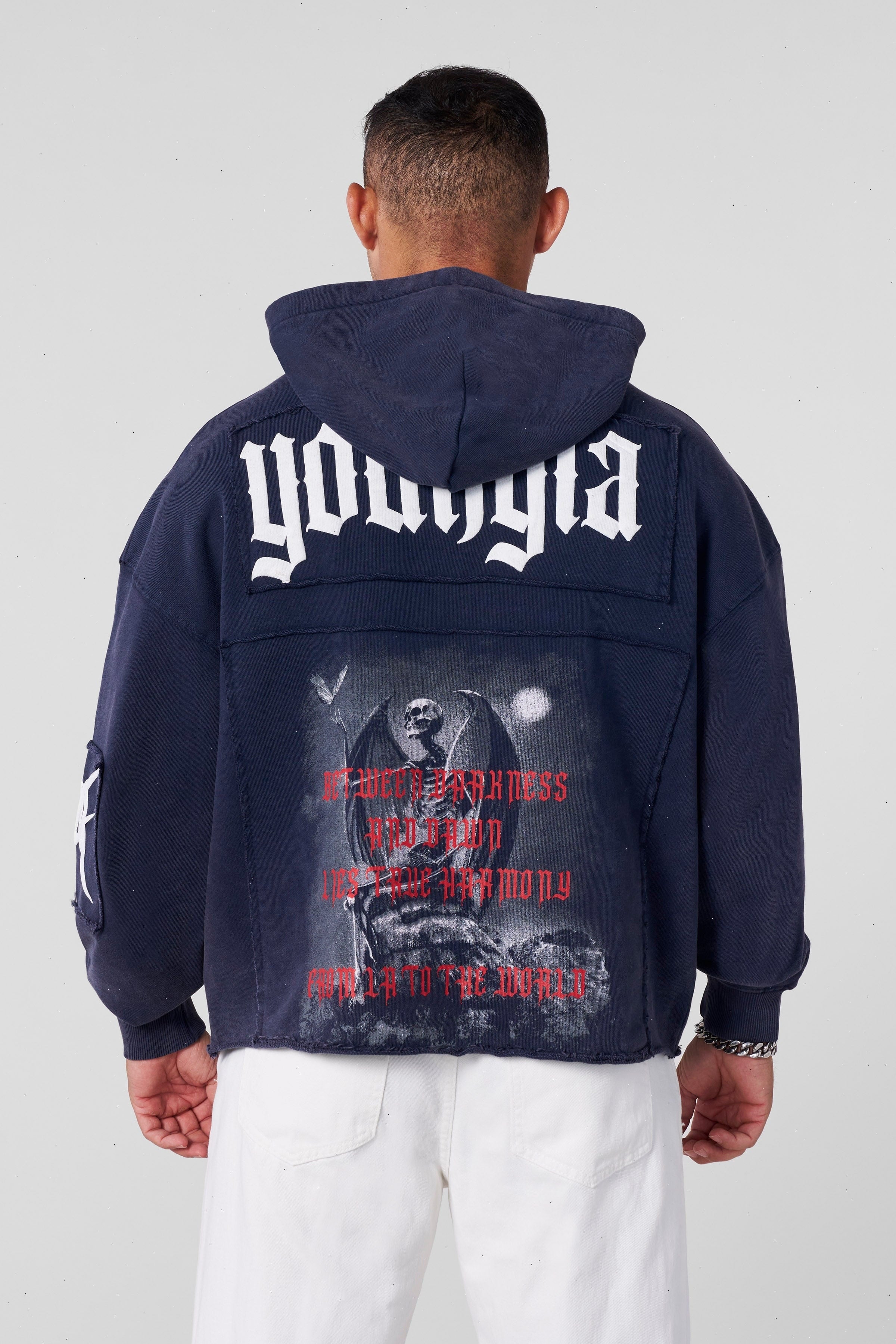 DESIGN: Make a statement with this heavyweight hoodie featuring bold gothic lettering across the shoulders and an oversized reaper graphic on the back. Finished with distressed red text and dark, moody artwork, this piece delivers true streetwear edge.