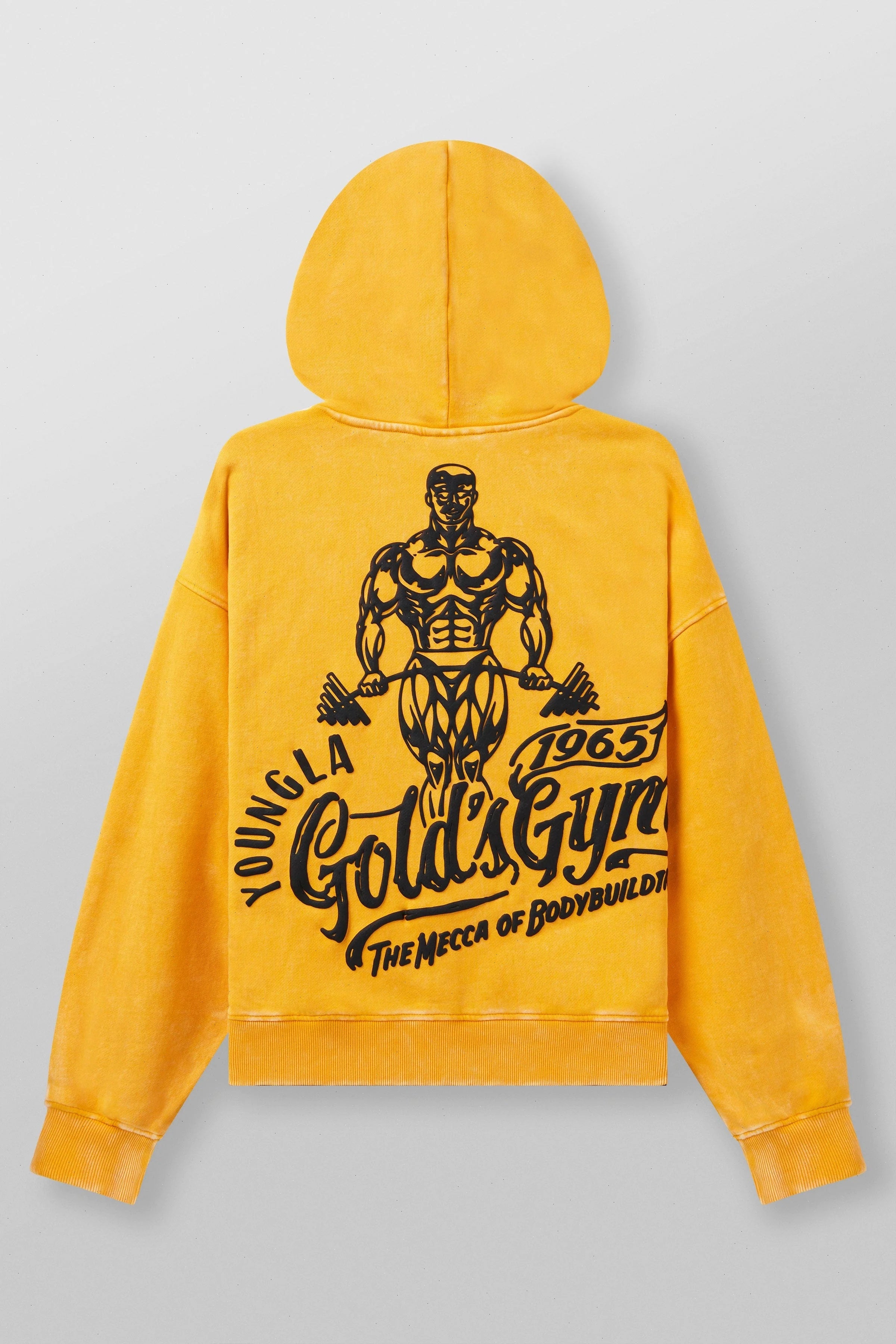 DESIGN: This Gold’s Gym x YoungLA zip-up hoodie offers a perfect mix of comfort and iconic style. With a relaxed, oversized fit and a bold puff print graphic on the back, it’s crafted with washed fabric for that vintage vibe. Throw it on for an effortless look that stands out in any setting.