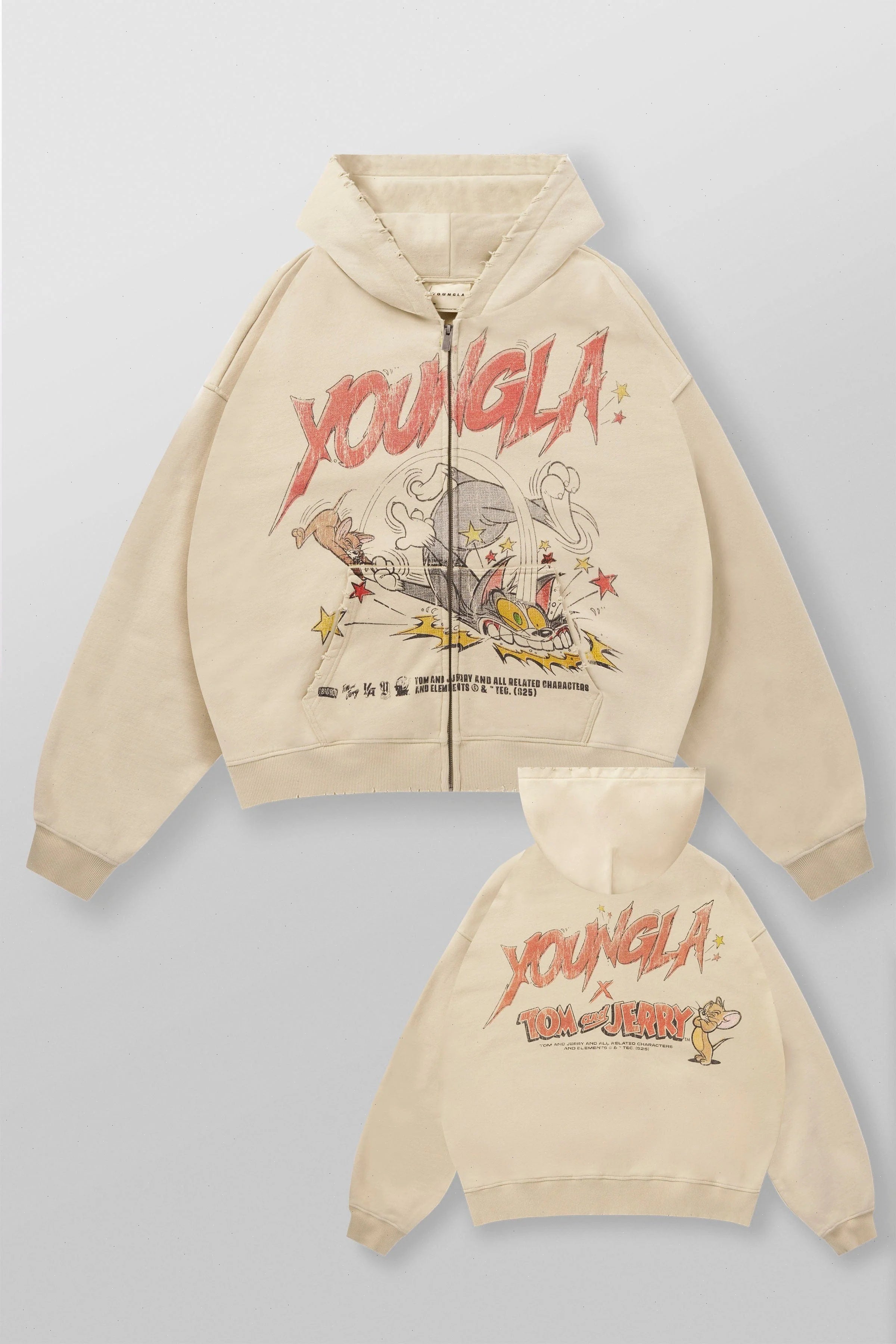 DESIGN: A heavyweight zip-up hoodie created in collaboration with Tom & Jerry™. Made from premium 460 GSM fleece with a washed finish for a vintage, lived-in feel. Each design features custom artwork of Tom and Jerry in training-inspired or action scenes, printed with high-detail color and character accuracy. Built with a drop-shoulder fit, roomy hood, durable front zipper, and ribbed cuffs for comfortable everyday wear. The loose silhouette gives it that relaxed, throw-on look perfect for layering.