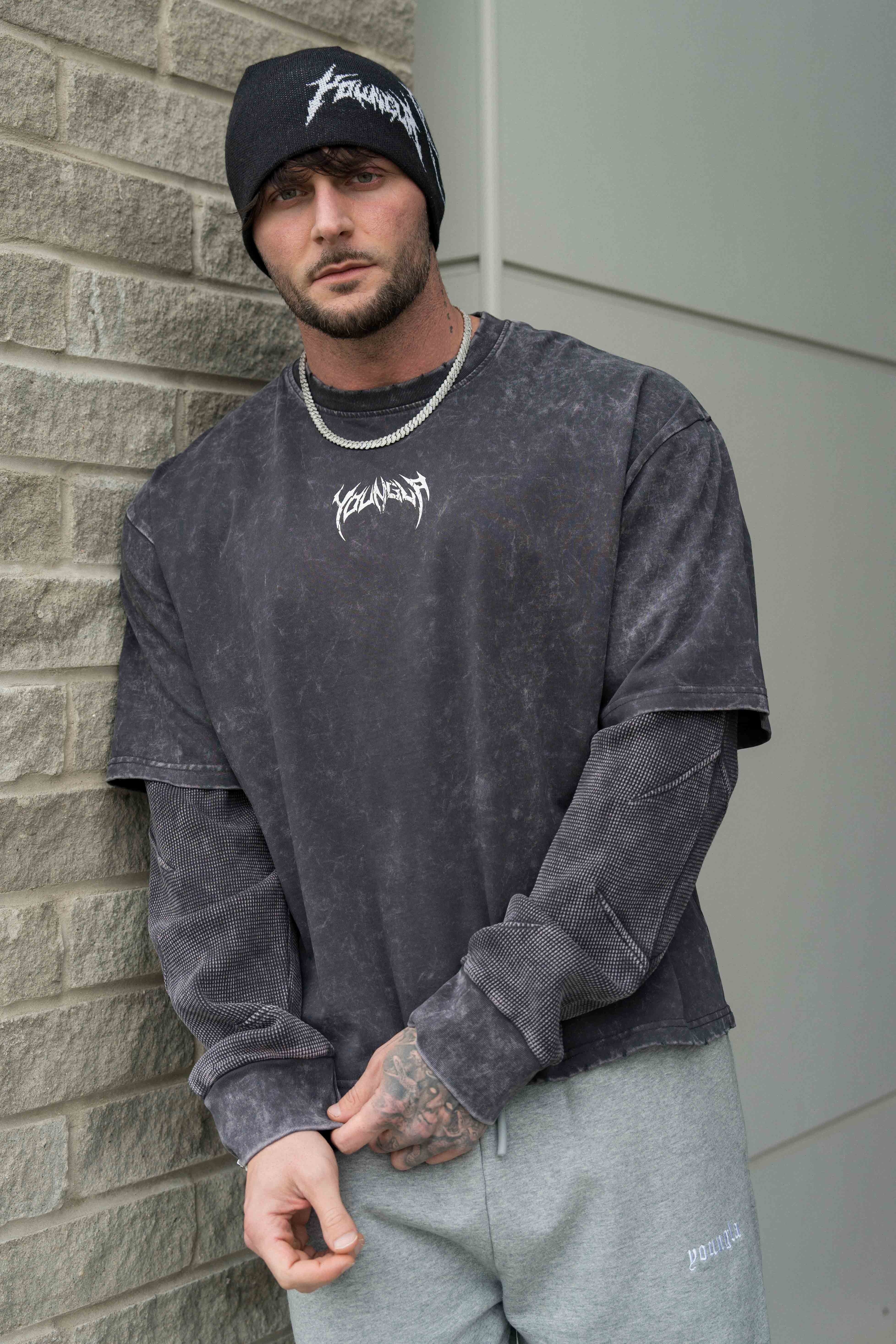 DESIGN: Introducing the Shadow Twofer Long Sleeve—a unique fusion of style and texture. Crafted from soft cotton, it combines a vintage acid-washed body with cozy thermal under-sleeves for added warmth. Featuring distressed cuts on the collar and hem, this twofer delivers a bold, worn-in look that stands out.