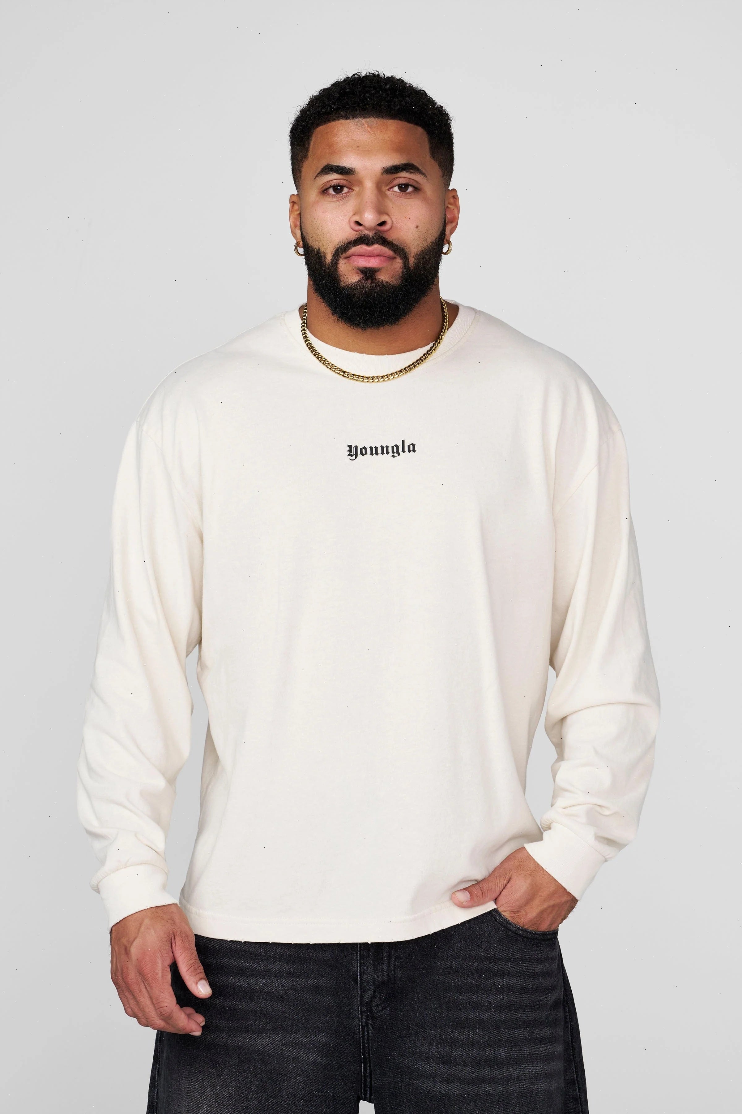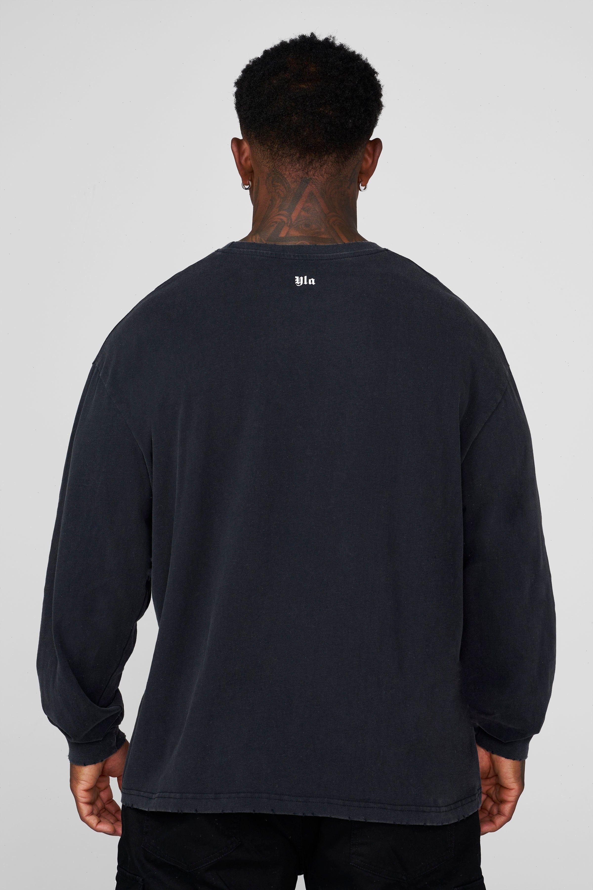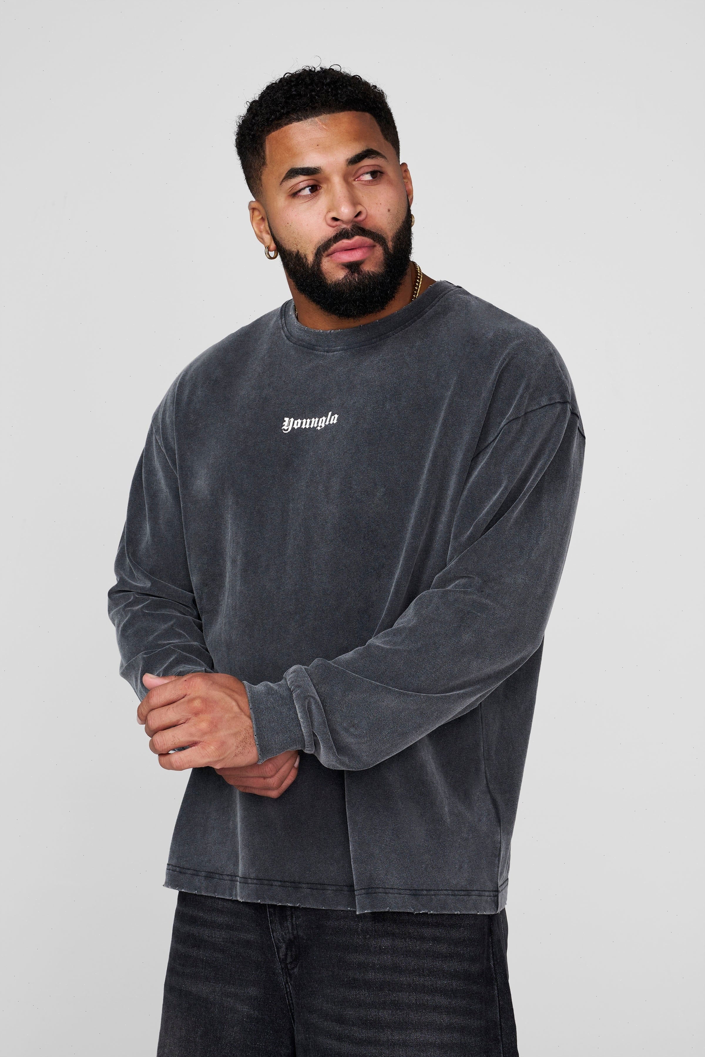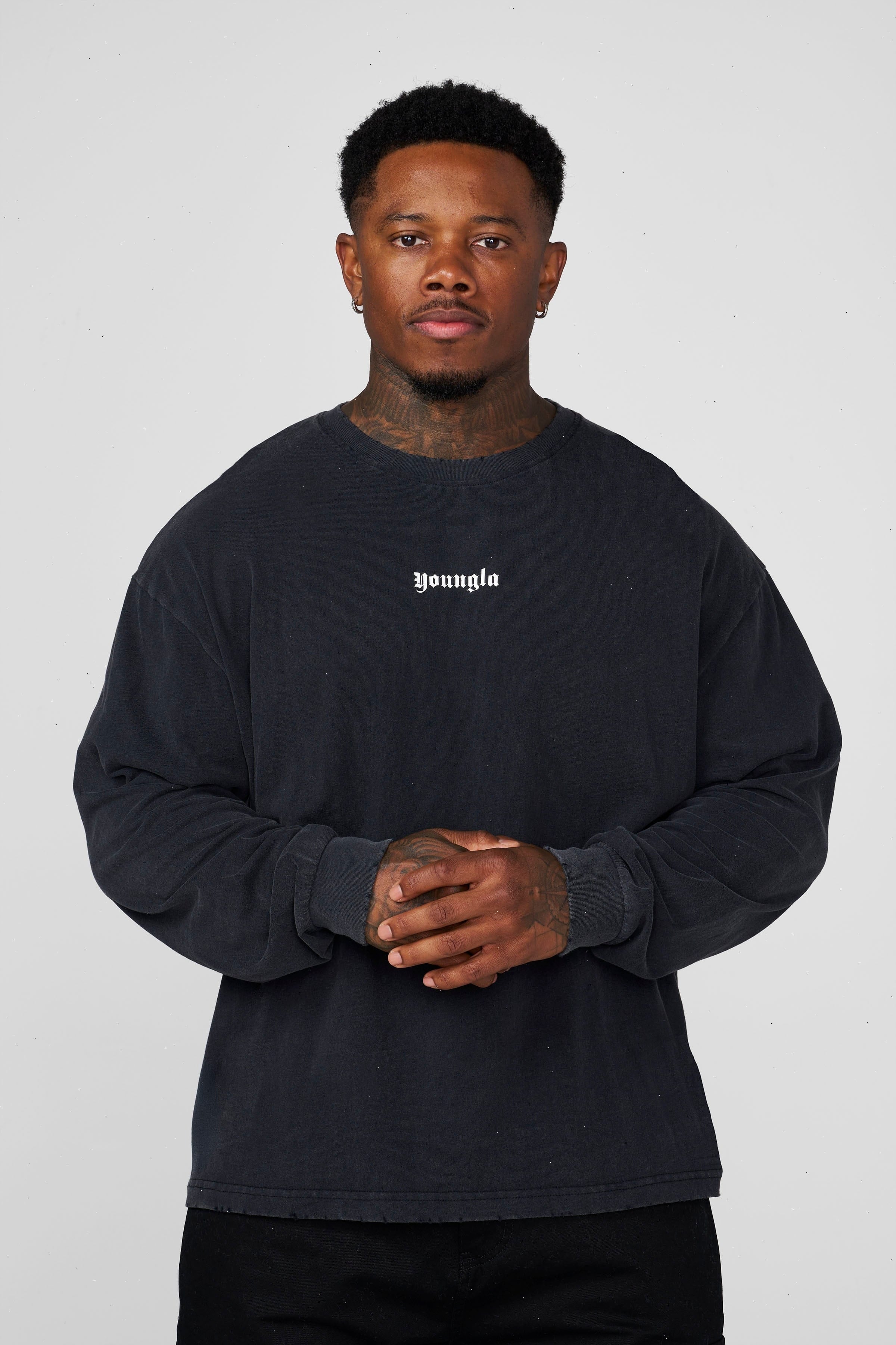 DESIGN: A lightweight long sleeve tee with a soft, peached finish that gives the fabric a smooth, velvety hand-feel. Designed with a relaxed silhouette, dropped shoulders, and a vintage-inspired mineral wash across all colorways. The raw-edge neckline and subtle distressing add a worn-in character without compromising comfort. Finished with minimal YOUNGLA front branding and ribbed cuffs to keep the sleeves sitting clean.