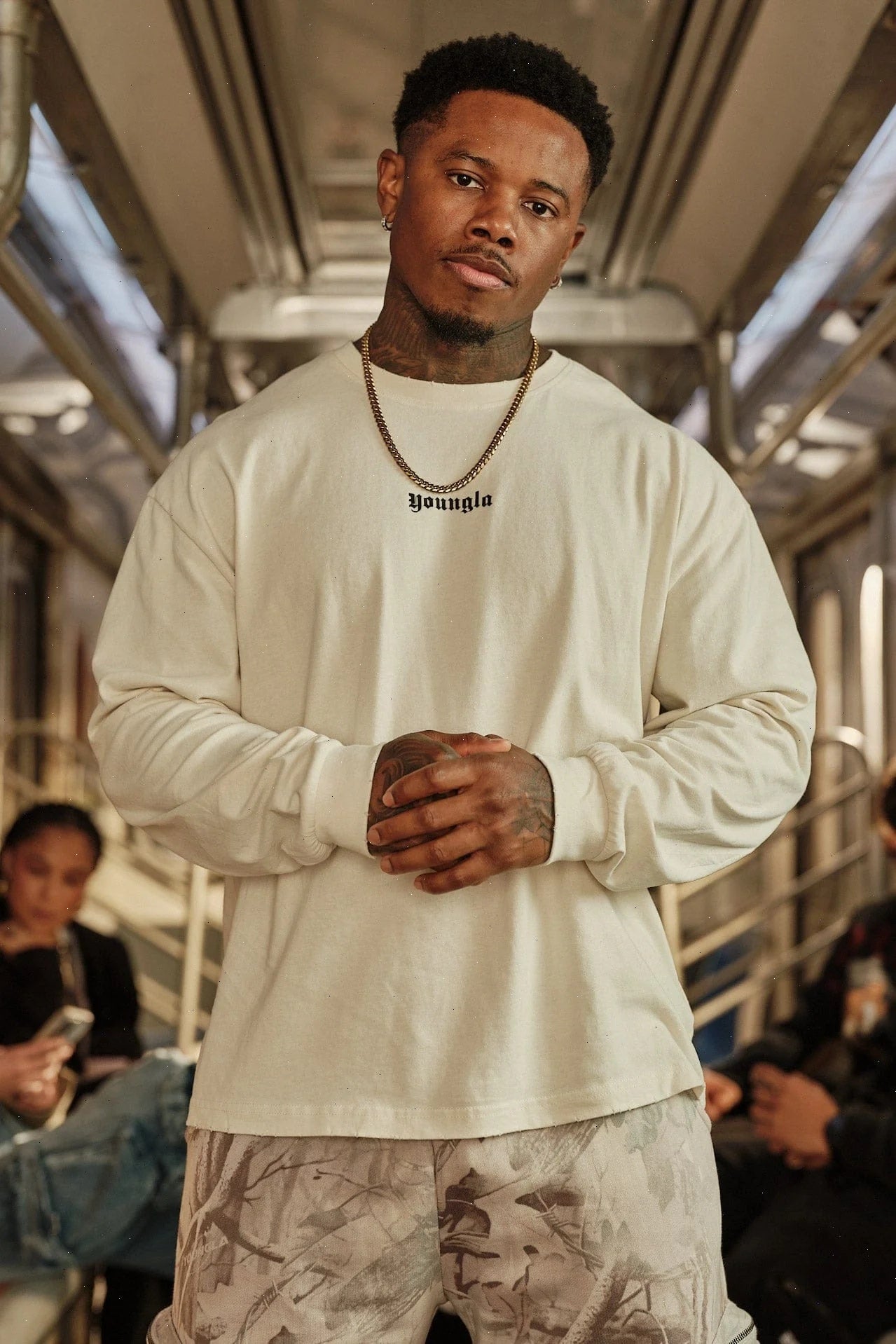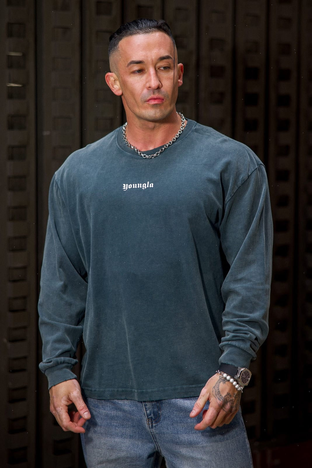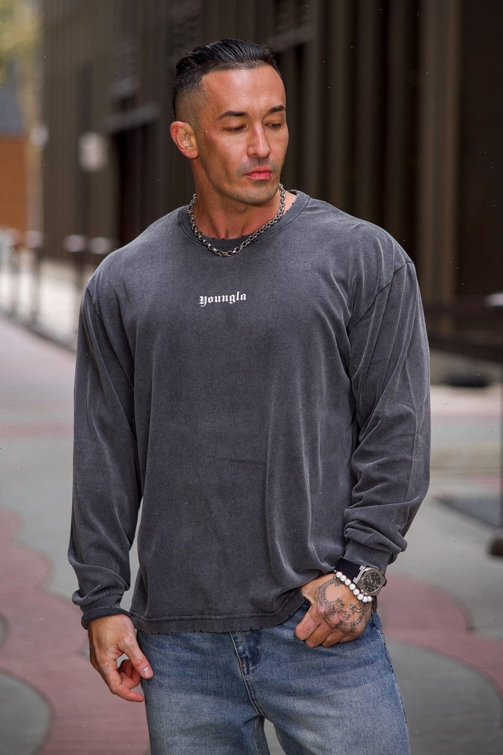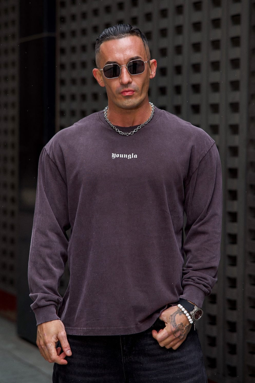 DESIGN: A lightweight long sleeve tee with a soft, peached finish that gives the fabric a smooth, velvety hand-feel. Designed with a relaxed silhouette, dropped shoulders, and a vintage-inspired mineral wash across all colorways. The raw-edge neckline and subtle distressing add a worn-in character without compromising comfort. Finished with minimal YOUNGLA front branding and ribbed cuffs to keep the sleeves sitting clean.
