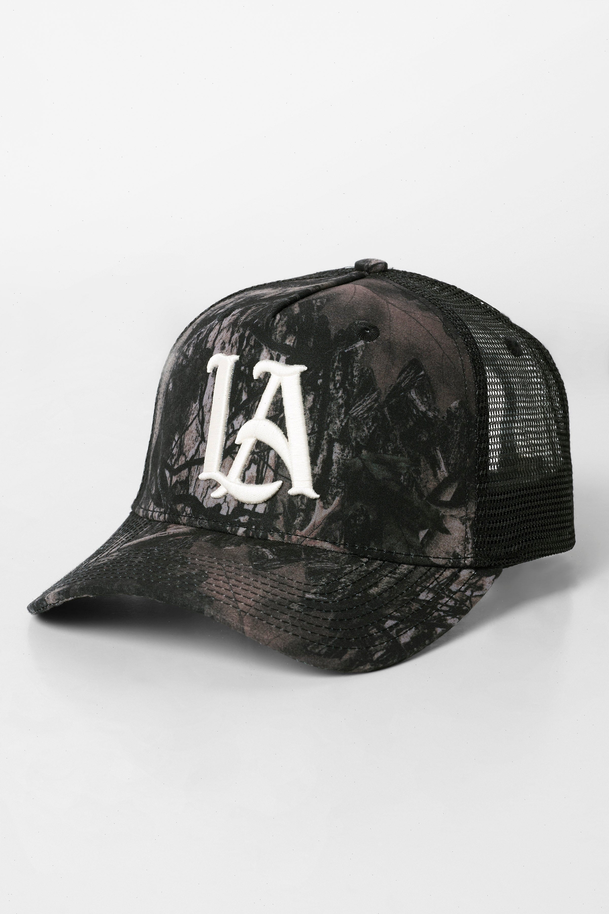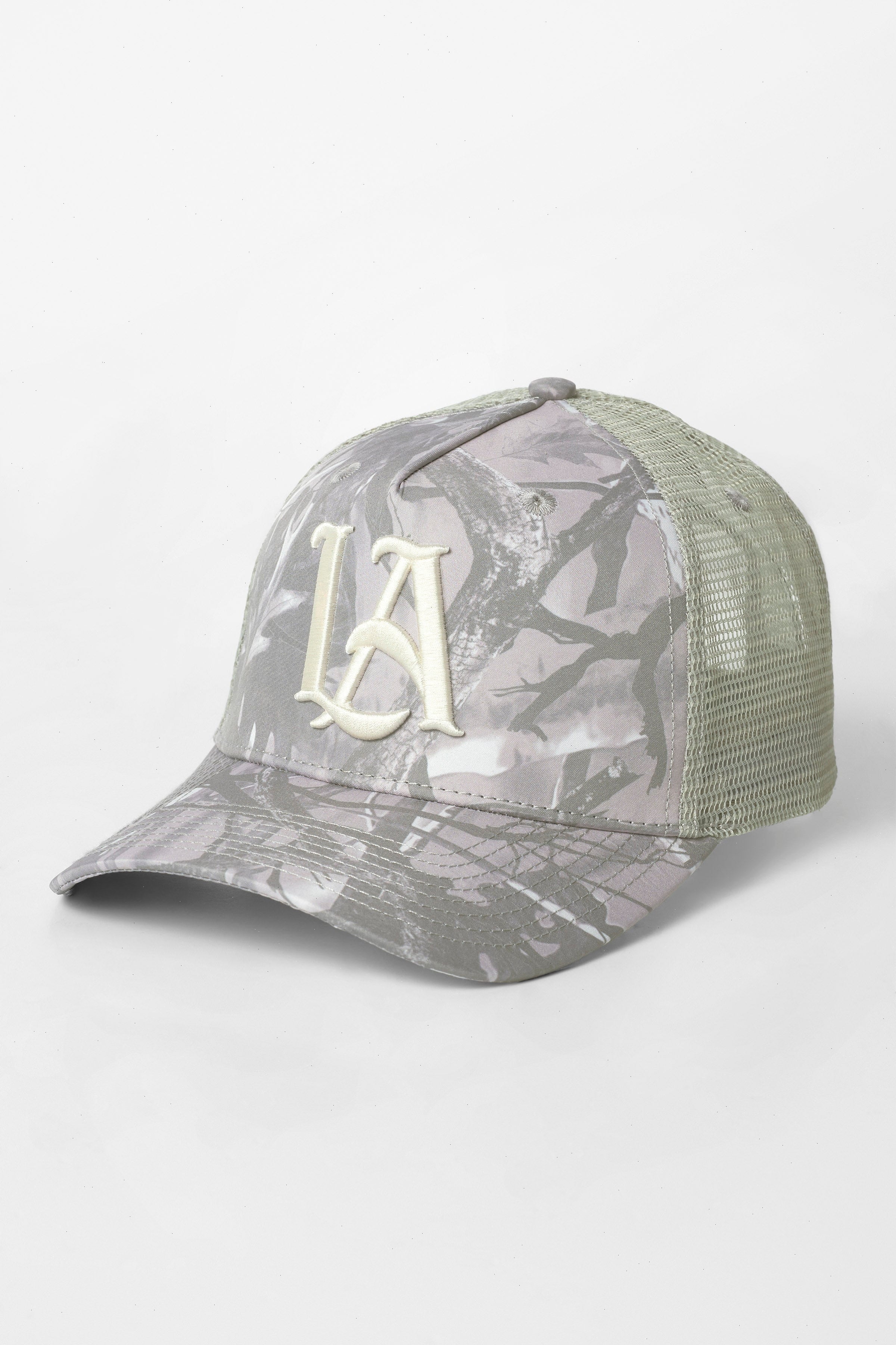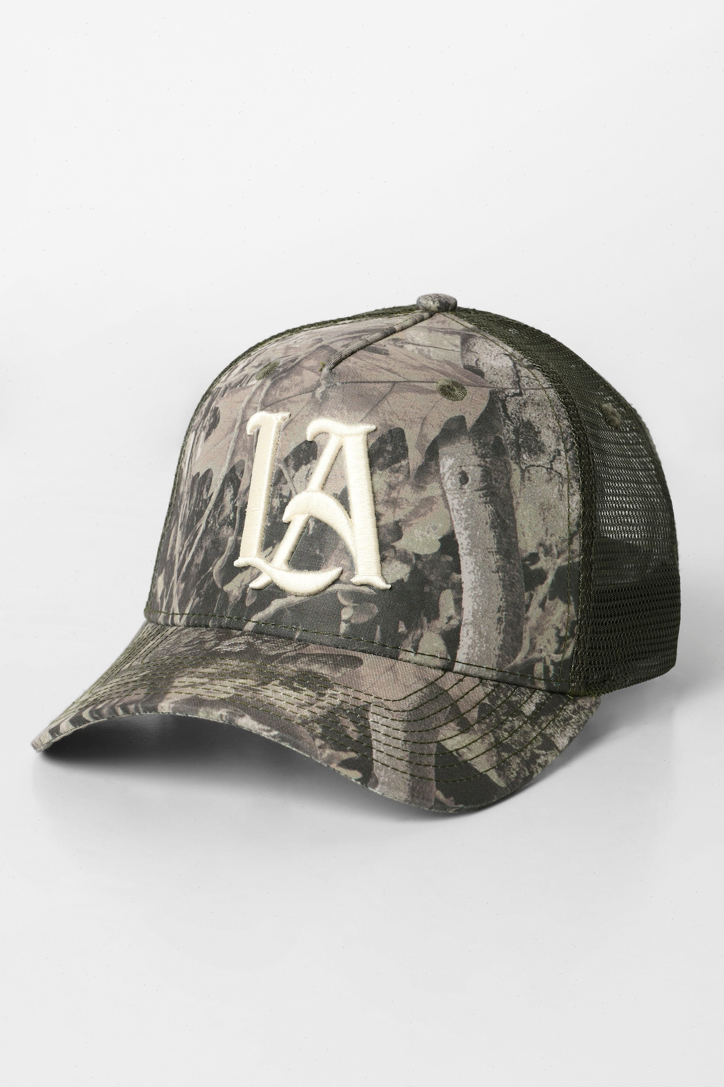 DESIGN: This Tree Camo Mesh Trucker Hat features a bold camouflage design with breathable mesh backing for comfort. The front showcases an embroidered "LA" logo, offering a stylish and rugged look, perfect for outdoor activities or casual wear. Adjustable for a custom fit.