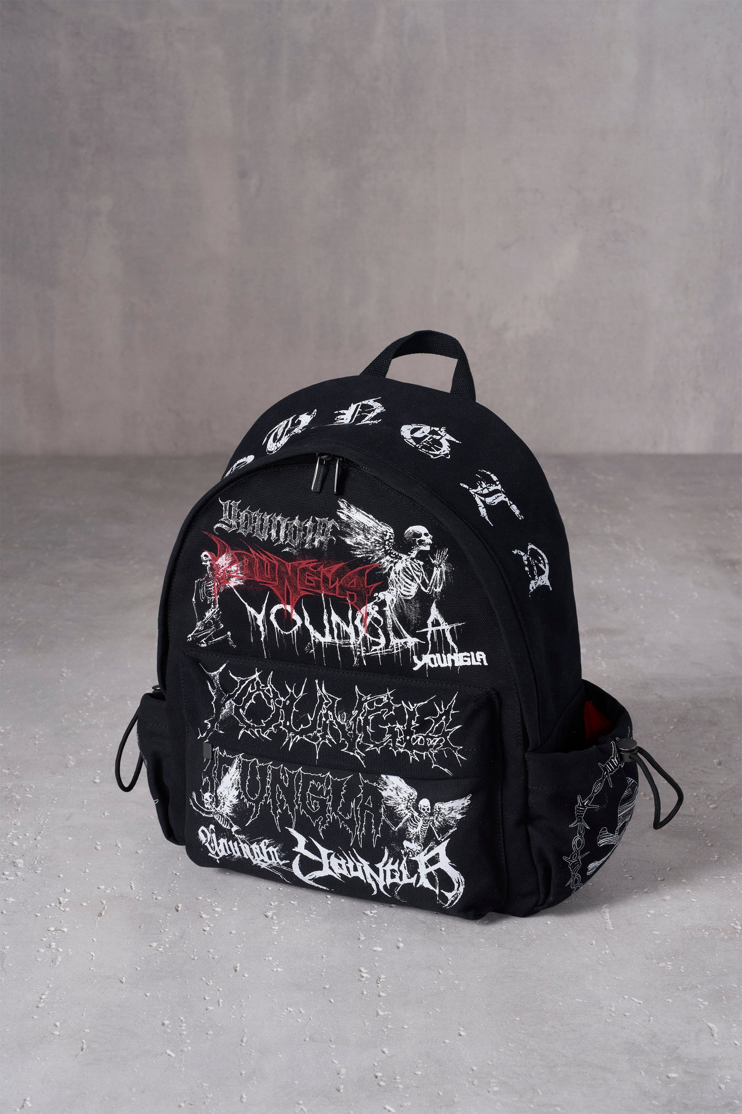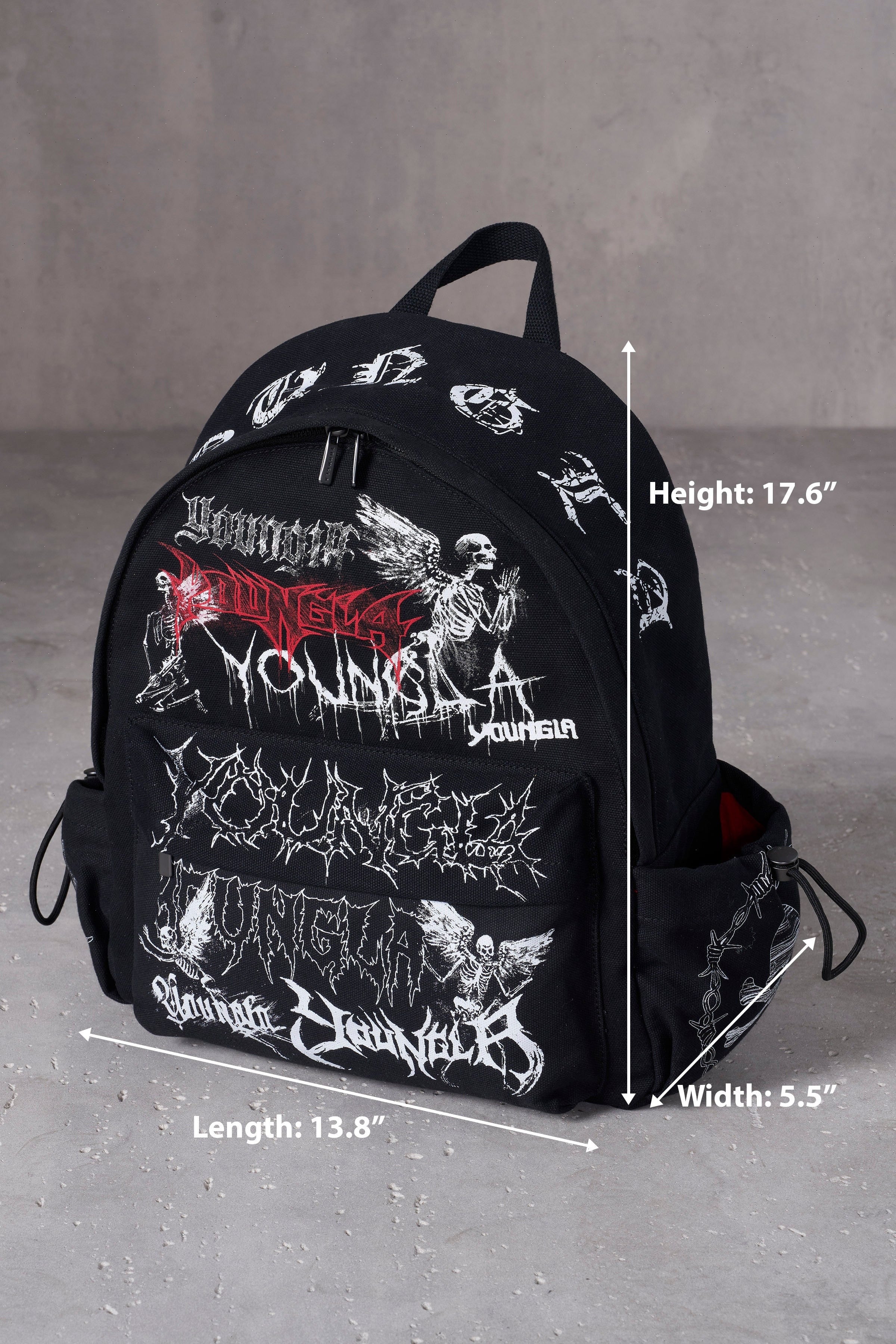 DESIGN: This canvas backpack brings back the nostalgia of school days with its edgy, all-over graphic print reminiscent of hand-drawn whiteout designs. Built for both style and functionality, it features two side pockets with adjustable drawcords, perfect for water bottles or shakers. The padded back and thicker shoulder straps ensure comfort for everyday use, while the interior includes a laptop sleeve to keep your tech secure on the go.