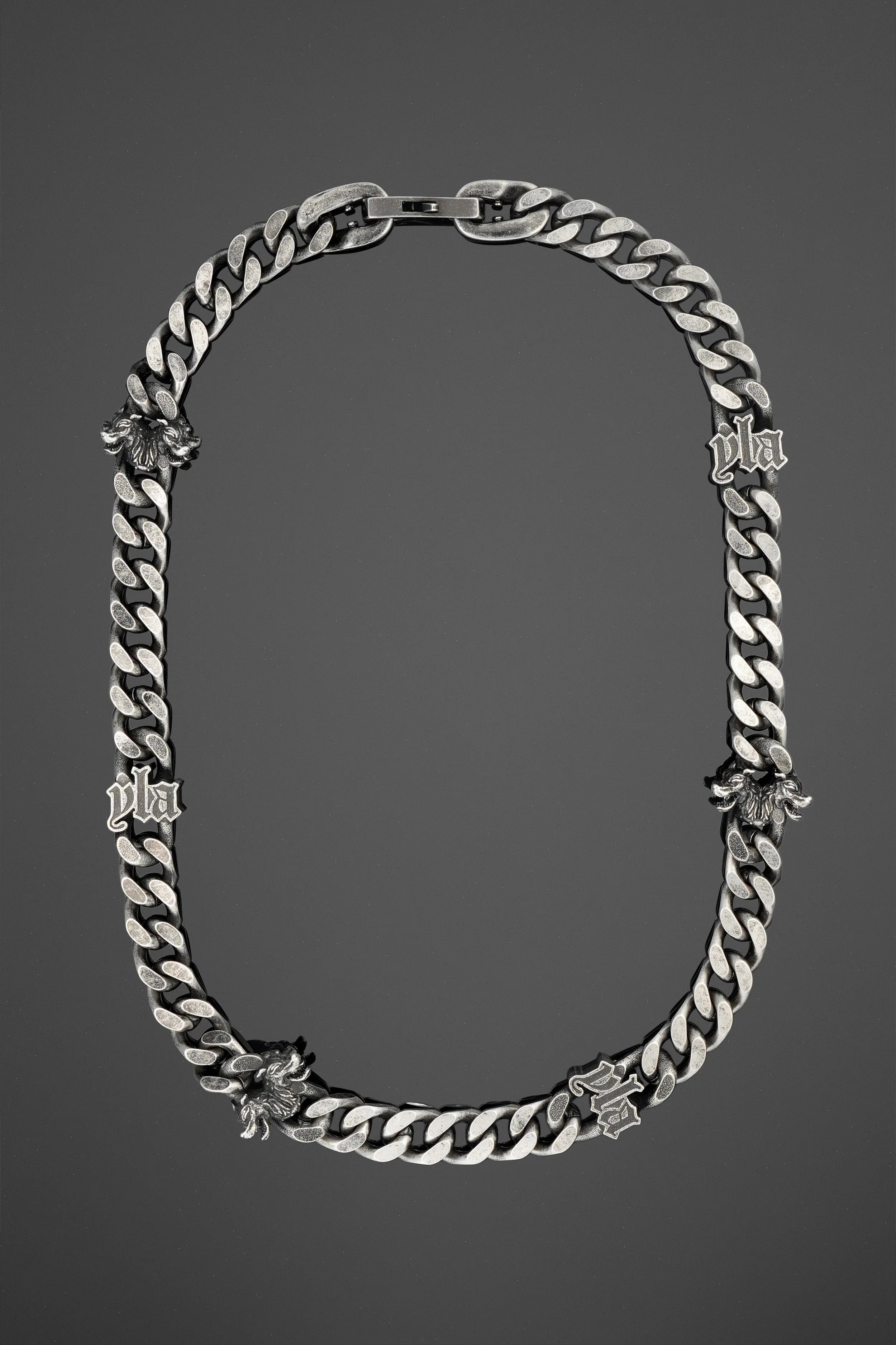 DESIGN: This necklace makes a bold statement without saying a word. Its industrial link construction creates a strong, architectural silhouette, while the old silver finish gives it a timeless, lived-in character. Signature logo links provide a refined detail that catches the eye up close. Durable yet versatile, it transitions effortlessly from casual streetwear to elevated, polished looks, giving any outfit an instant edge.