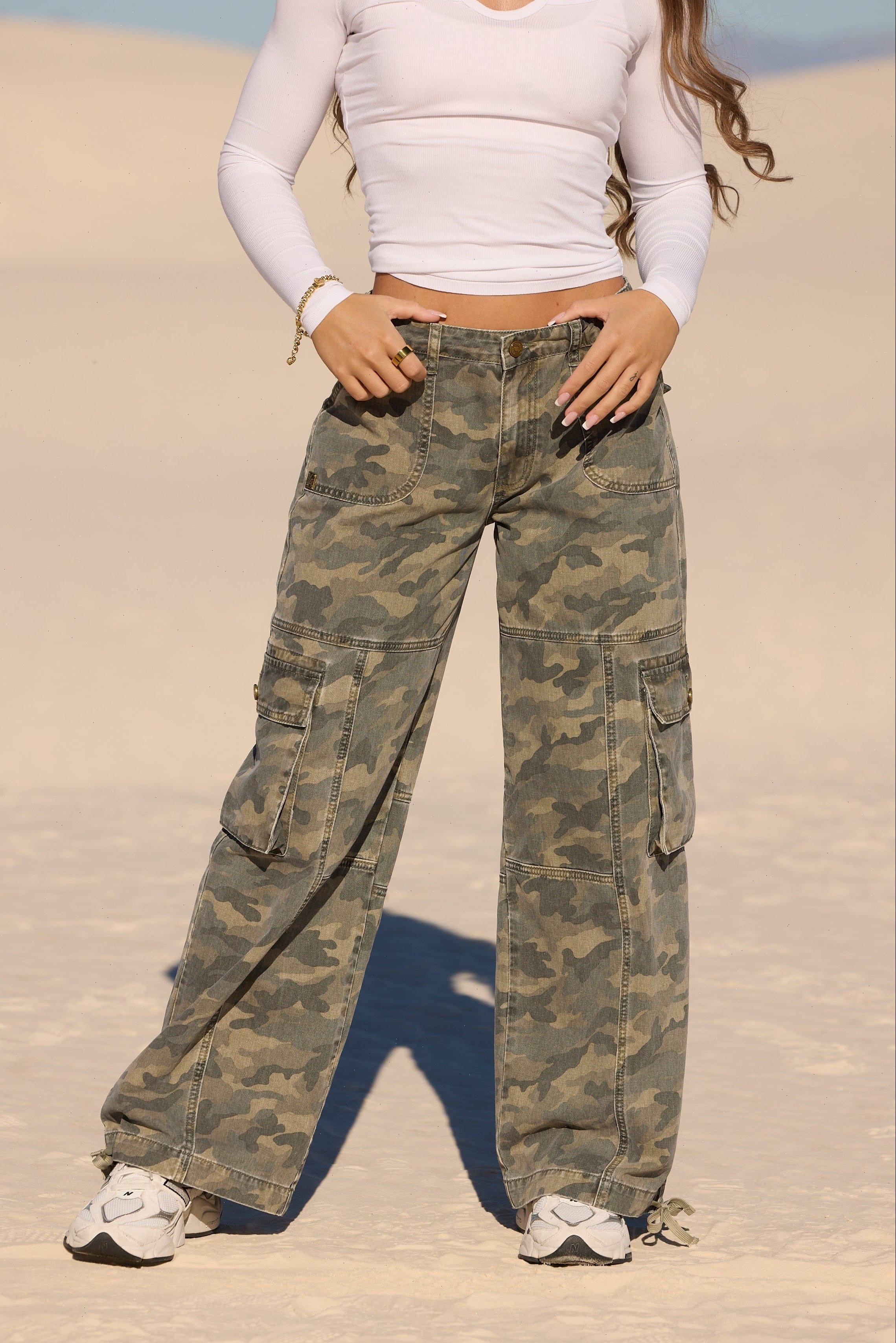 DESIGN: Utility meets style. The Camo Cargo Denim Jean is crafted from mid weight denim with an all-over camo print and cargo pocket detailing for a functional, street-ready look. Featuring a baggy fit and an adjustable waistband for comfort and flexibility. These jeans combine bold style with practical wearability, perfect for making a statement without sacrificing ease.