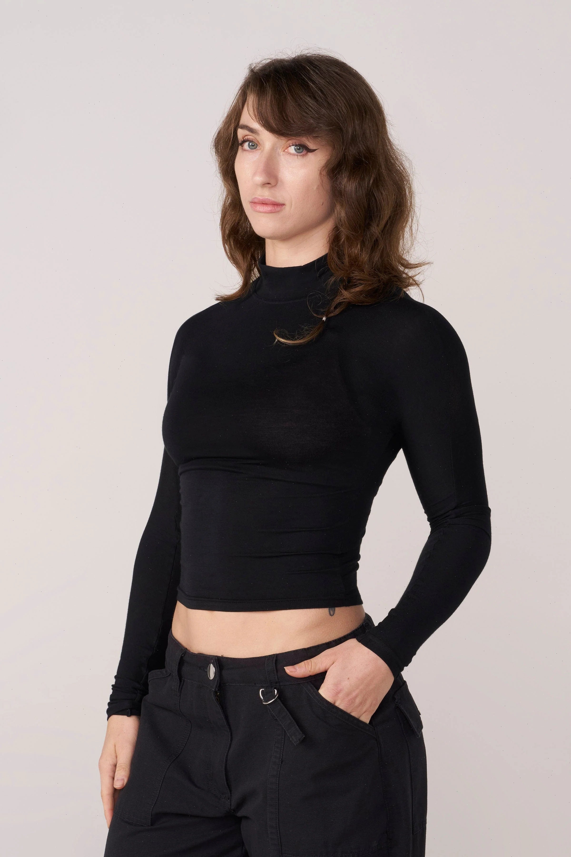 DESIGN: Spicy, sleek, and sheer in all the right places. This top is a fitted, sheer long sleeve that brings the heat whether you’re dressing it up or layering it down. With a second-skin fit and a high-neck silhouette, it’s serving effortless confidence with a side of mystery.